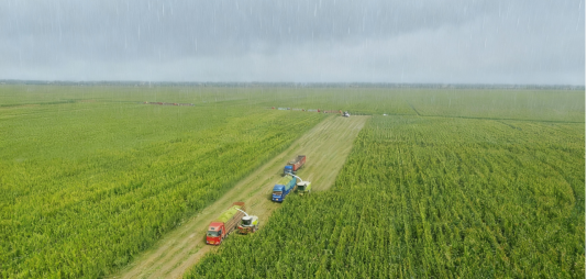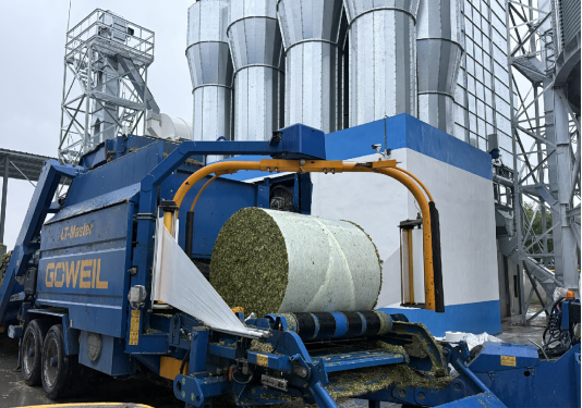 为守住这片孕育好奶的“源头阵地”,得益乳业以“技术+人力”双轮驱动,提前启动应急预案,用两大核心举措筑牢抢收效率与品质的双重防线。一方面,紧急调配国内先进的链轨克拉斯收割机与特种车辆组建专业作业团队,24小时轮班不间断穿梭田间,精准捕捉每一个停雨间歇高效抢收,确保“雨停即开工”;另一方面,创新采用“裹包+窖贮”收贮的模式,青贮收割后经初步质检,立即启用奥库MP2000-X青贮打捆包膜一体机现场裹包锁鲜,同时搭配传统窖贮形成互补,既大幅度的提高收贮效率,更从源头避免雨淋导致的品质损耗,真正的完成“应收尽收、应抢尽抢”。