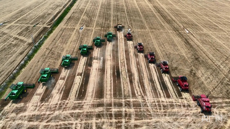 亳州市蒙城县许疃镇土桥村里,3台大型联合收割机正在进行收割作业,与一般农机比较,它们的割幅更宽、功率更加高,一天作业面积将近200亩。本年,蒙城县的小麦面积近200万亩,为了加速收成进展,当地投入2万多台(套)各类收割机、打捆机等大中型机械,一起强化农机网格化装备,保证小麦颗粒归仓。